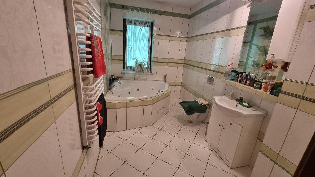 W korytarzu łazienka z wanną z hydromasażem i umywalką , toaleta osobno
