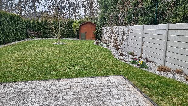 Posesja ogrodzona zadbana, obsadzona iglakami, wykonana studzienka na deszczówkę zamontowane są domofon i bramy na pilota